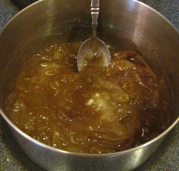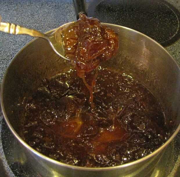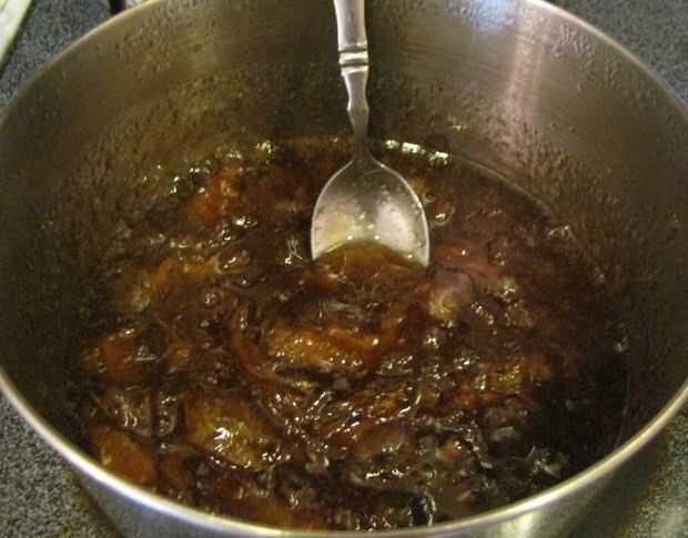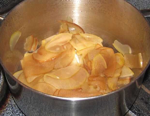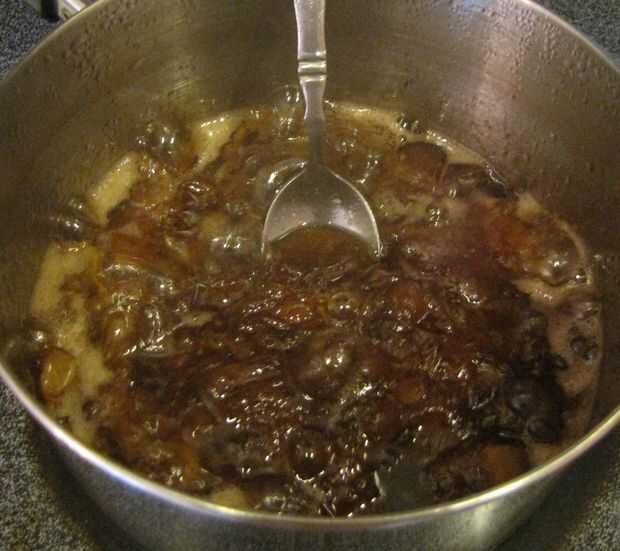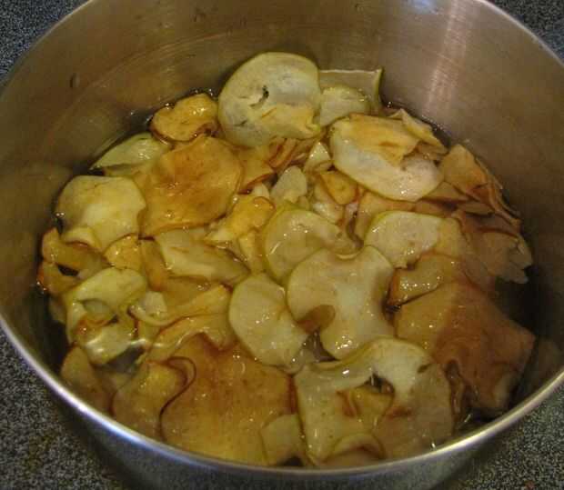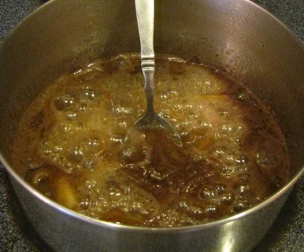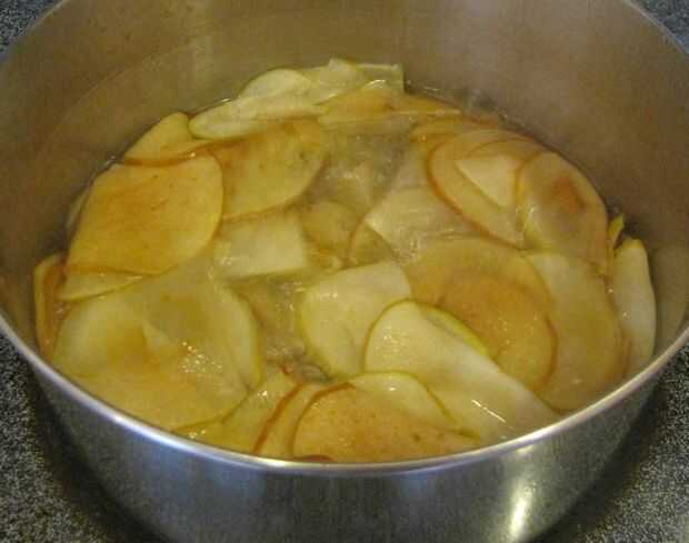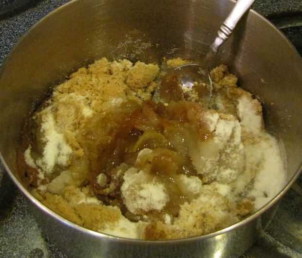 A continuación combinan los re-hidratan las manzanas, azúcar (granulado y marrón), maicena y sal y llevar a hervir. Continuar a hervir hasta que el almíbar comience a espesar. Una vez que la mezcla es lo suficientemente gruesa como para el grupo en el extremo de una cuchara, retire del calor y frío.