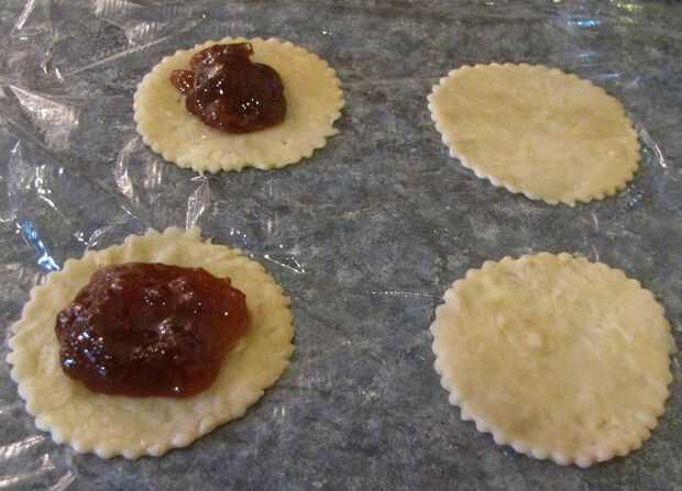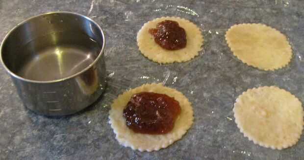 Para empanadillas, cucharada de la masa aproximadamente 1 de relleno en el centro de 2 x 2" de tarta. A continuación, agregue un pedacito pequeño de agua fría hasta el borde exterior de la corteza inferior. Luego tome otro 2" tarta y superior a la otra, asegurándose de que se tire de los bordes uniformemente. Finalmente con un tenedor, aplaste los bordes de las empanadas para sellarlos. Repita hasta que todas las cortezas de la empanada pequeña han sido utilizados.