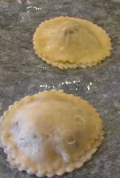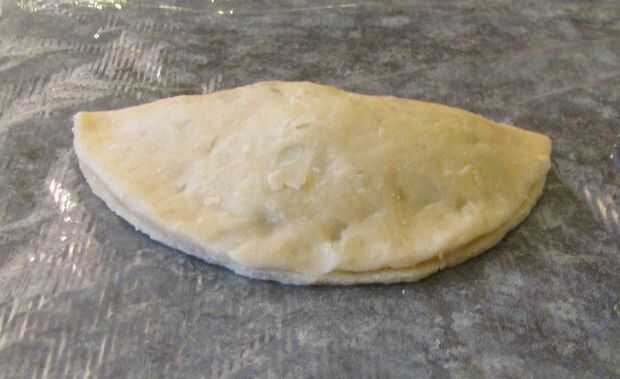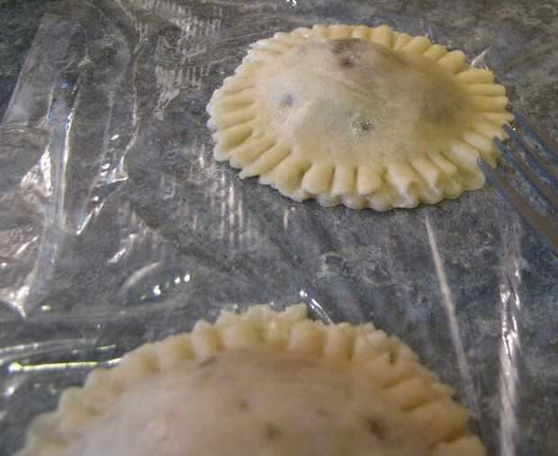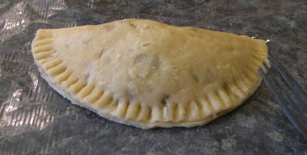 Para pasteles de la mano de media luna, cucharadas de la masa aproximadamente 3 de relleno en el centro de cada pastel de 6" de corteza. A continuación, agregue un pedacito pequeño de agua fría hasta el borde exterior de la corteza. Luego tome una mitad del pastel de 6" de la corteza y doble sobre la otra mitad (creación de una media luna), asegurándose de que se tire de los bordes uniformemente. Finalmente con un tenedor, aplaste los bordes de las empanadas para sellarlos.