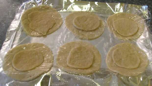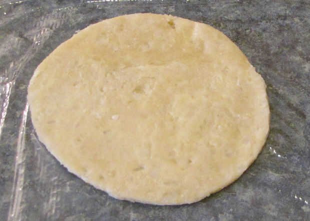A continuación tomar la 4 de las rondas y ponen hacia fuera en un pedazo de envoltura de plástico, en el mostrador (Esto mantendrá se pegue a la encimera).