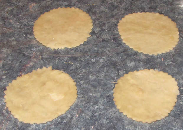 Una vez que la mezcla ha tenido tiempo para enfriarse, estás casi listo para hacer pasteles. Retire la bandeja para hornear, con las rondas de la masa, del refrigerador y deje reposar unos 10 minutos en el mostrador. Esto ayudará a que sean más flexibles y mucho más fácil trabajar con.