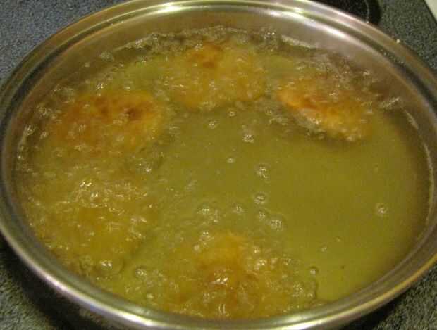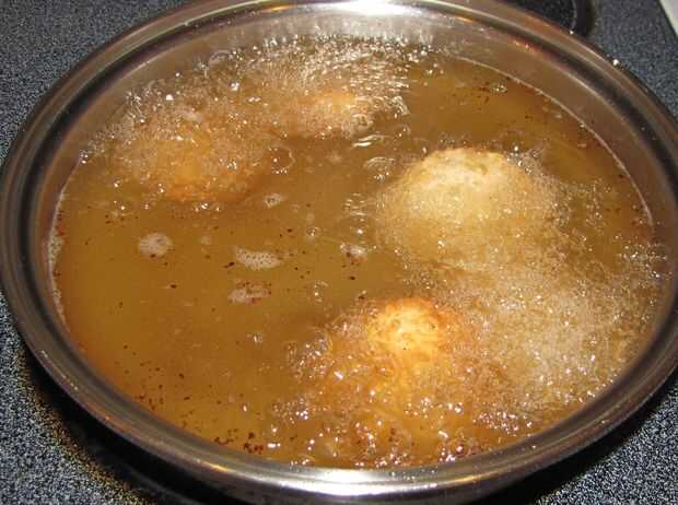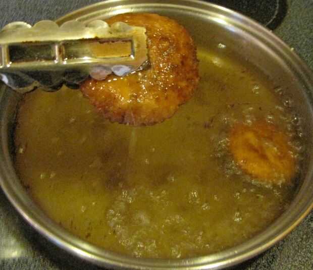 Cuando esté listo, añadir la tartas individuales al aceite caliente (probar para asegurarse de que queden separados uno del otro), freír hasta que comiencen a flotar, flip y freír hasta que estén doradas por ambos lados. Retirar del aceite y déjelos escurrir ligeramente, antes de colocarlas en un plato forrado de toalla de papel, enfriar.