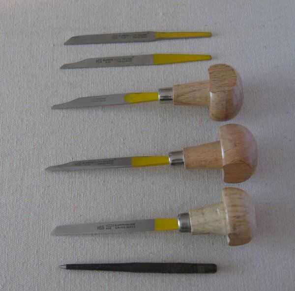 Los buriles que utilizo son (de arriba a abajo): 1/8 de plana, 1/16 en plana, 3/64 en plana, 1/16 en V buril cuchillo más grave y redondo golpe. Para la mayoría del trabajo conducir los buriles con un martillo.