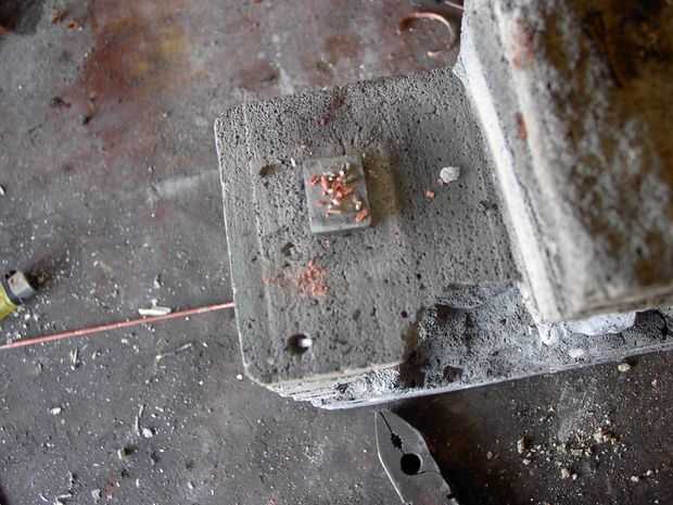 Ahora que tiene una serie de orificios incompletos en el acero, necesita hacer algo para llenarlos con. He utilizado una varilla de soldadura de aleación de cobre, este material está diseñado para pegar bien en acero, por lo que parece una gran opción. Cortar pequeños fragmentos de la barra si usas uno y colocar los pedacitos en los orificios. Se debe aplicar suficiente metal para llenar los agujeros y un poco más. Como derrite, a flujo y como se enfría otra vez, te contrato, dejando una depresión en la parte superior los agujeros. Esto obviamente implica menoscabo alguno de la apariencia de la pieza.