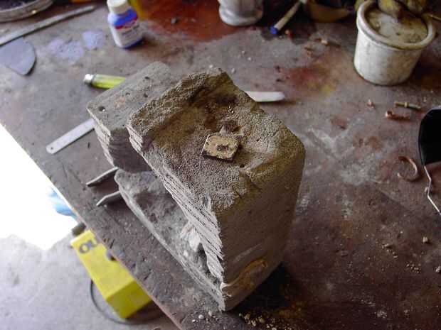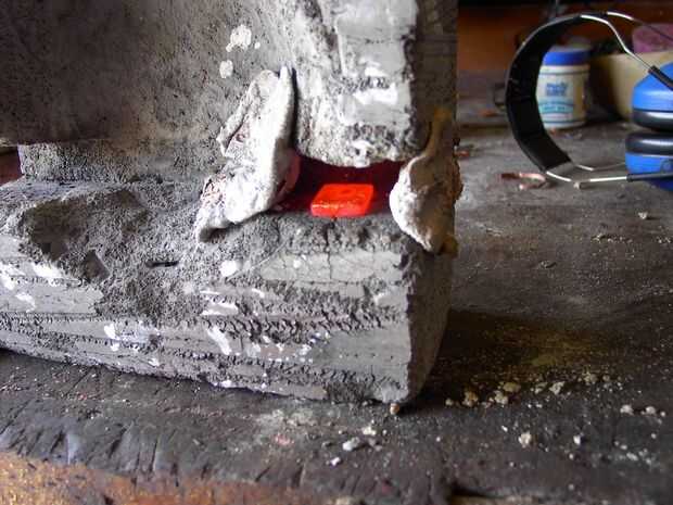 Una vez que esté satisfecho que todos los huecos están llenos de metal, y que no va a escapar en cualquier lugar, ir y obtener una bebida, o algo. Cuando que vuelvas, el metal debe ser lo suficientemente frío como para proceder al siguiente paso. No recomiendo esperar hasta el metal había solidificado luego enfriar el acero en agua. Cosas se contrae cuando se enfría, y las fuerzas de contracción podría decir podría ser lo suficientemente fuerte como para reventar un tapón de aleación hacia fuera. Espere que se enfríe por sí solo.