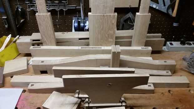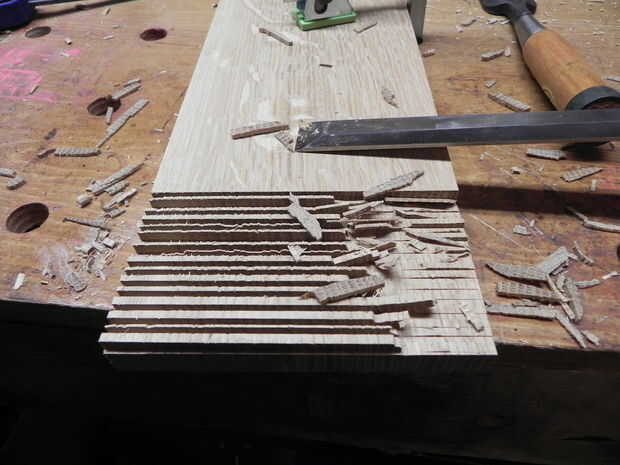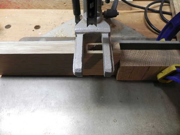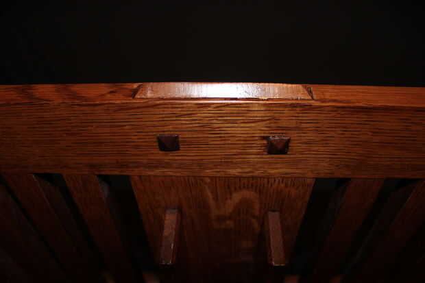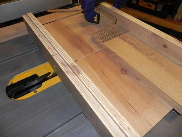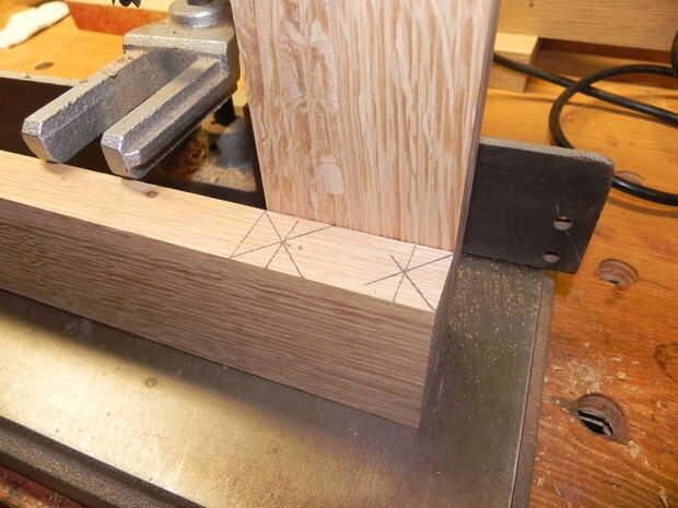 Cortar espigas en las piezas verticales que tienen la longitud suficiente para sobresalir por ½" en la parte superior. Mina se hicieron con varios pases en un trineo de Sierra de mesa que luego de limpiados con un cincel y un bloque de plano. Una vez que tenga un ajuste suficiente, cortar un bisel de 45 grados desde la parte superior de las tres espigas expuestas.