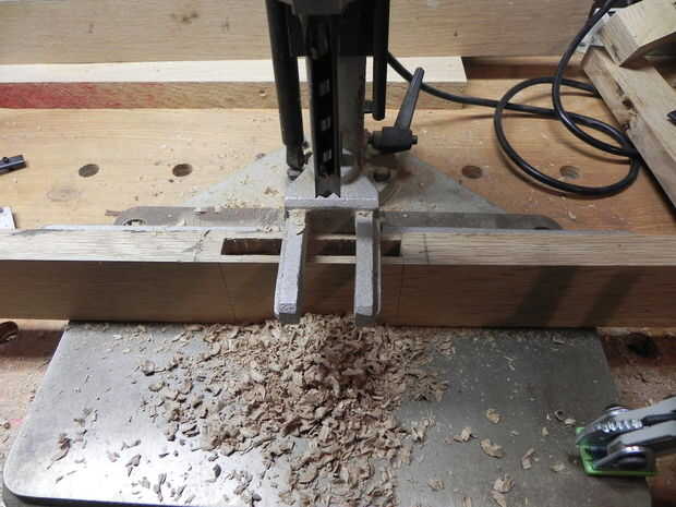 Posiblemente el reto más difícil del proyecto. Medir el tamaño del resto que está buscando y corta la madera gruesa de 1" para adaptarse. Para anchos, fui con un 2.5" top, música profunda resto de 2", 3.5" inferior, 2.25" para los lados, listones de 3 x 1" por lado y un centro de 5.5". Marca a través de mortajas en la parte superior del tablero y cortarlas en la escopleadora. Los cortes en la parte inferior del espejo, pero sólo ir tan profundamente como le sea posible.