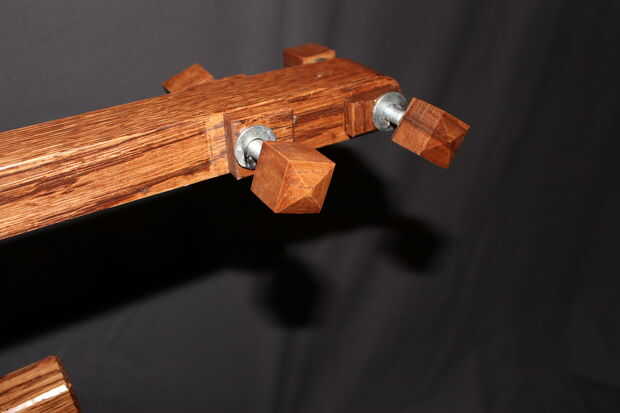 Además, he añadido pequeñas tapas para la parte superior los pernos por epoxying cubitos roble @ 1" por lado en los tornillos de cabeza cuadrada y tuercas. Lijar las tapas a 30 grados para que coincida con el resto del proyecto. Suerte encontrar tornillos de cabeza cuadrada que eran fáciles de ocultar en una mortaja.