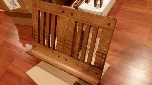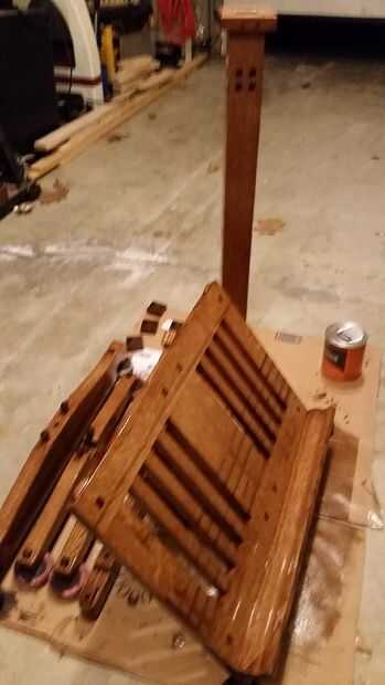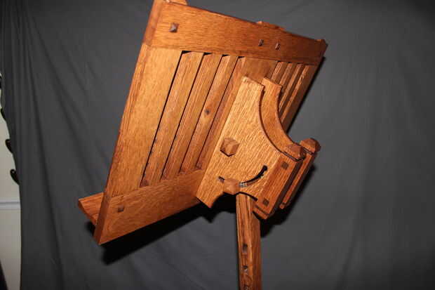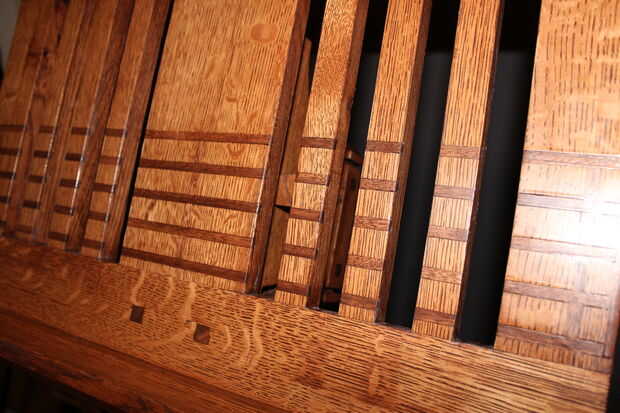 Hay multitud de opciones disponibles para la coloración y el acabado del soporte. Usé una mancha de gel de roble de la misión para dar todo el proyecto un marrón, incluso tono que mejora el contraste con la nuez. Una vez seca la mancha, hacia un barniz claro para completar el look. Para mantener la apariencia de la época, ir a un poliuretano satinado o semi-brillante. Aplique varias capas finas a todo el proyecto, lijar suavemente con lija de grano 600 o lana de acero 000 entre cada uno. Ver gotas o burbujas y corregirlos como aparecen. Al final, también puede Agregar una muy fina capa de cera para dar un bonito proyecto, incluso del resplandor.