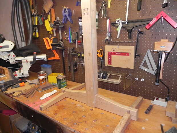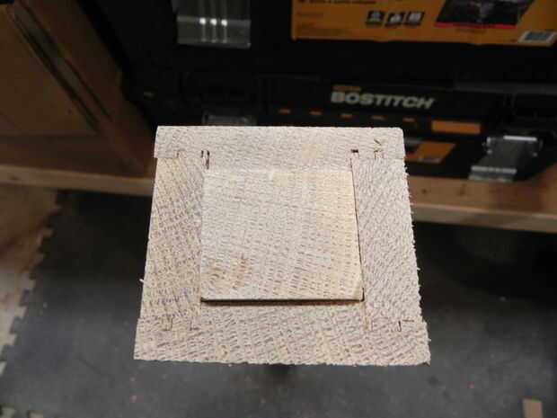 Cuando el cuadro está seco, usar el resto de la Junta de igual longitud para hacer un post para caber comodamente por el interior. Inserte completamente el poste y corte una mortaja a través del centro del lado de la caja de aproximadamente 3" de la parte superior para dar lugar a una llave de ajuste de altura. Quitar el poste y situado en la escopleadora, reajustar la valla y mortajas similares hasta el fondo intervalos ~ 2". Use un formón para pare los agujeros, en la parte superior e inferior para hacer más fácil insertar la clave más adelante.