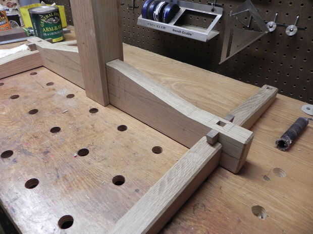 Con las piernas más pequeñas cortadas a la medida, establecer en un trineo de inglete y cortar aproximadamente 1/8" de la parte inferior, dejando una plataforma de 1.5" en cada extremo para los pies. Esto es más fácil con una hoja de ranurar o un router con una broca recta pero opté para alisar hacia fuera con un cincel en su lugar.