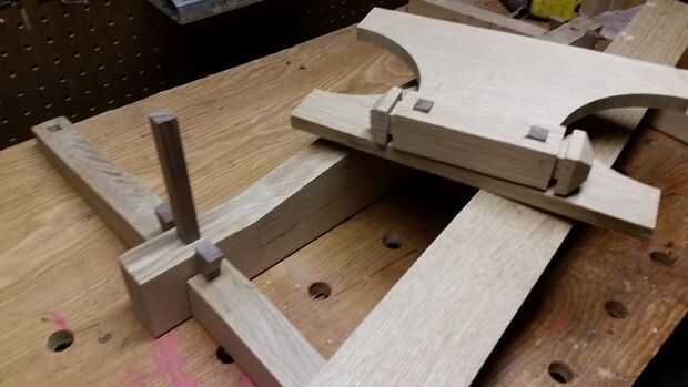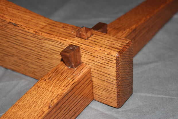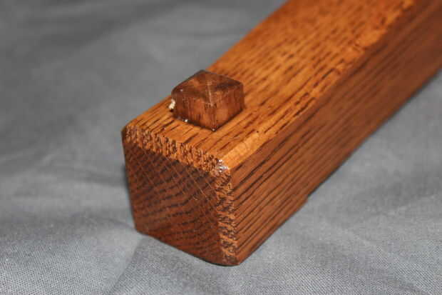 Al lado de los empalmes del regazo, cortar nogal clavijas para ser a 1/2 "x 5/8" x 1,5" larga y ahusada les hacia abajo con la banda de sierra para asemejarse a una espiga de ajuste de fricción. Use un cuchillo para derribar las esquinas y que cada uno vea a mano. Pegamento en su lugar, con los pies montados para posicionarlos correctamente.