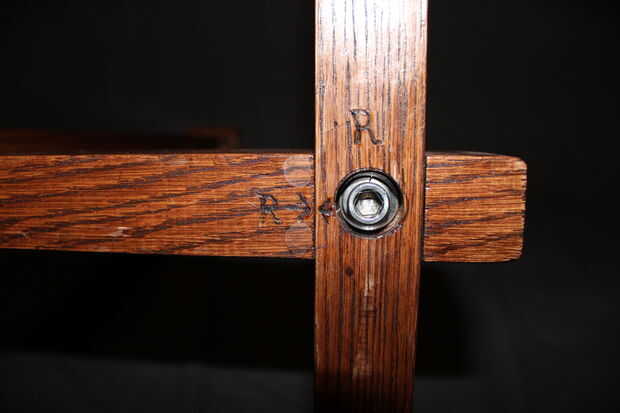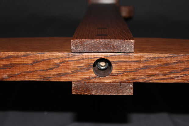 Agrande los orificios inferiores (donde pasará el tornillo) a 25/64" o de 13/32" para permitir que el perno pasar más fácil y agrandar los agujeros superiores a ½" para aceptar el collar. Montar los collares con cuidado y añadir una hendidura en la parte inferior con una broca Forstner para ocultar las arandelas y el perno de cabeza de ¾".