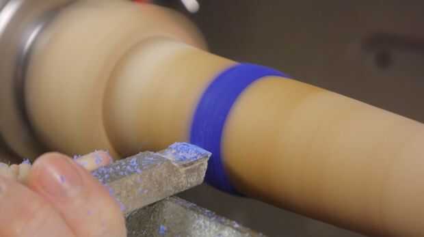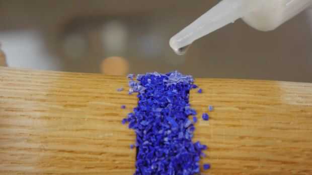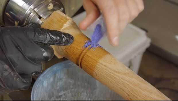 Añadir piedra a las ranuras con pegamento delgada de CA para unir todo. Seguir todo el camino alrededor de la manija para llenar la ranura entera. Entonces utilice una herramienta de carburo o HSS para tallar para cortar la piedra color a la madera.