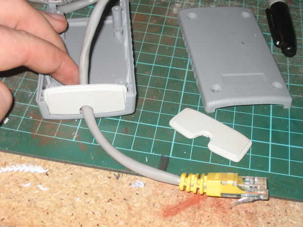 Tomar las lengüetas de la caja vino con (suponiendo que utilizó un recinto similar) y cortar una pequeña porción de cada uno. El cable Ethernet debe encajar cómodamente sin ser comprimido dentro de estos orificios.