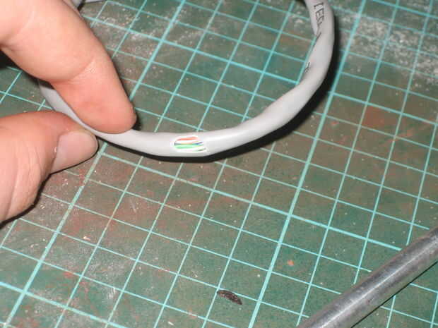 En primer lugar, tomar un x-acto cuchillo y gently corte lejos el plástico externo del cable.