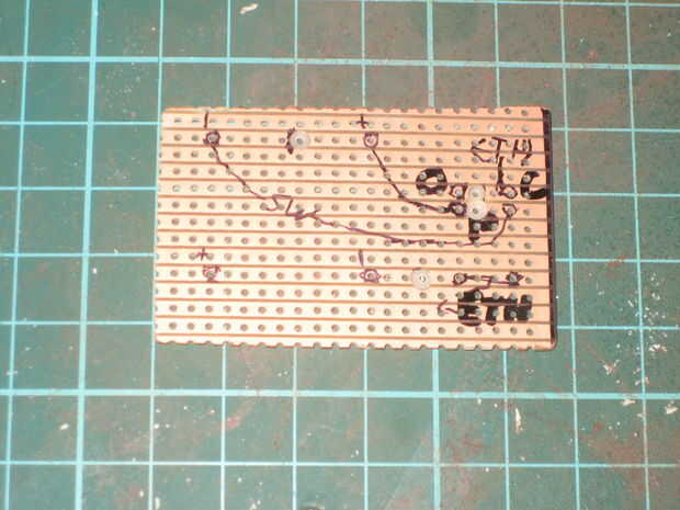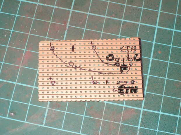 Si está utilizando el tipo de veroboard que tiene tiras a lo largo de él, en lugar de almohadillas individuales, usted querrá dibujar en las "roturas" de dejar ahora cortos circuitos.