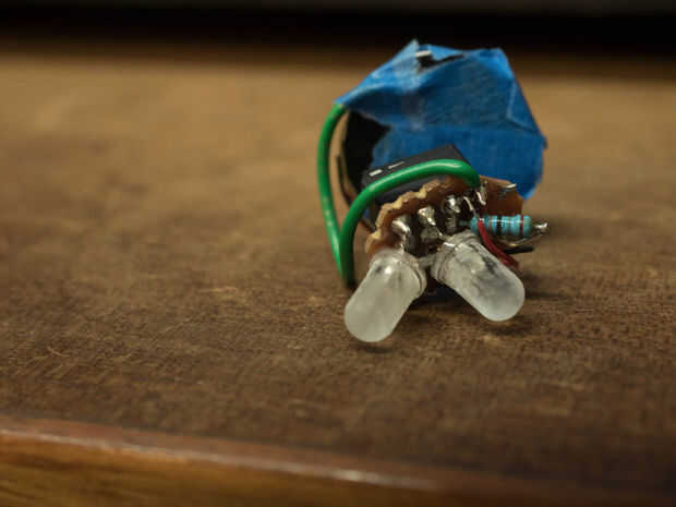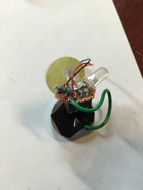 Vamos a bicho muerto este circuito porque es muy sencillo. Marca un lugar 4 x 4 en el perfboard, y conectar los dos LEDs y resistente, como se muestra en el diagrama dibujado a mano. Asegúrese de que usted está en el lado metálico. Después de eso, instale el soporte del MCU, luego los cables piezoeléctricos. Por último, vamos a conectar un cable de la batería + lado al circuito, y luego podemos recortar nuestra junta! El circuito se enciende cuando toca el piezo - lado-lado de la batería (completando el circuito).