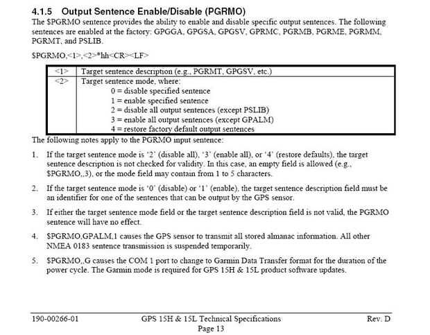 Suponiendo que hayas podido probar con éxito la unidad usando Minicom o Hyperterminal, debe ser capaz de enviar comandos a él también. Busque en el manual del producto, hay una sección llamada "GPS 15 H y 15 L interfaz de Software". Esta sección describe todas las frases que puede enviar a la unidad GPS para configurarlo. Es muy simple. Todo lo que tienes que hacer es una de las frases del programa.