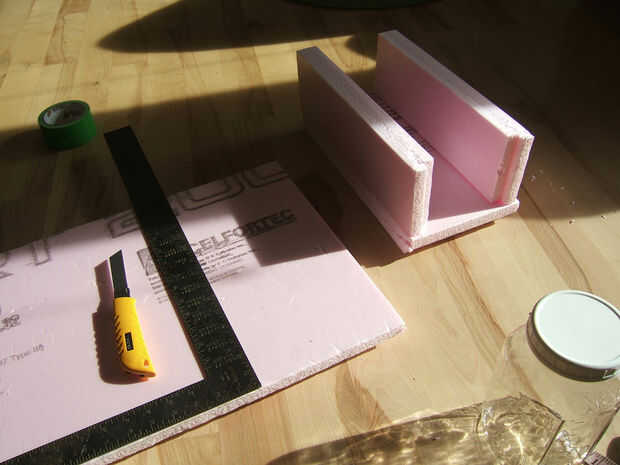 De medición: Ponga la tapa en el frasco y medir el ancho, profundidad y altura. La jarra de Bernardin de 48 oz que utiliza, medida 4 1/4 "x 4 1/4" x 7 3/4 ". Agregar sobre un 1/4" a cada una de estas dimensiones, para permitir un poco de juego y hacer más fácil conseguir su tarro dentro y fuera de la caja. Mida el grosor de su aislamiento rígido. Mina fue 1 1/2" de espesor.