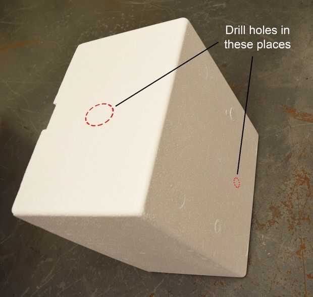 Una vez que haya terminado con soldadura, montaje, cableado y programación tienen casi todo para hacer una incubadora funcional y prueba. Dos más simple que hacer! Tienes que perforar un agujero en la parte superior de la caja de espuma de poliestireno para poner el portalámparas y el otro pequeño agujero en la parte inferior de la parte posterior para poner el alambre del termopar. Consulte la primera imagen. Poner el soporte en el orificio superior y la bombilla de tungsteno a éste.