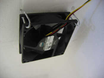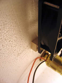 He usado una pistola de pegamento caliente para unir cuadrados legos en la parte posterior de mi ventilador, como separadores, así que el ventilador no es justo contra la pared de la nevera. Puedes usar un poco de la espuma de poliestireno sobrantes de la tapa, si lo desea, en lugar de otro. Para este ventilador, he probado conectarlo a la pared con trozos de gancho de alambre. Creo que esto permite una gran cantidad de vibración y así más ruido del necesario, pero aún no he encontrado una cinta que se pegue a la espuma de poliestireno, por lo tanto hay que ir. Se puede experimentar con la forma que mejor Coloque el ventilador en la pared. Me gusta poner minas así que sopla a través de/por encima de la bombilla de luz, el aire calentado.