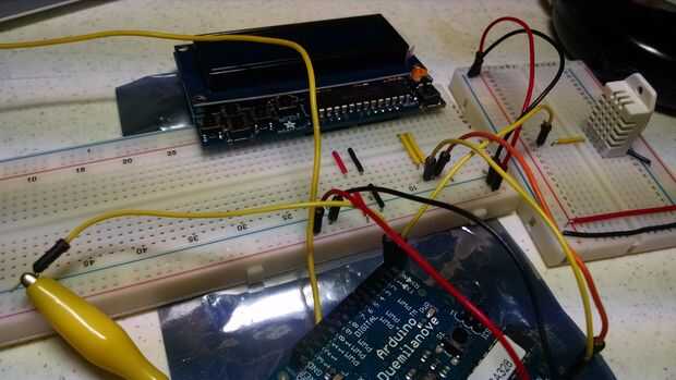 Entonces tengo todo trabajando para lo que espero son buenas especificaciones. La pantalla LCD proporciona una lectura de la temperatura actual y la humedad. Básicamente si la temperatura desciende por debajo de 100 grados, entonces poner en la luz, si va de 101, kick off. Simple. Parece que el ciclo la luz de encendido y apagado aproximadamente cada minuto a dos minutos.