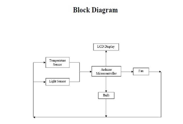 Hemos utilizado un sensor de temperatura (LM35) y sensor de luz (LDR) que sentido la temperatura y la intensidad de la luz dentro de la incubadora, la salida se proporciona para el microcontrolador de Arduino que toma la decisión basada en la comparación entre los valores de punto de ajuste deseado y los valores de entrada obtenidos del sensor. La temperatura actual se visualiza en LCD. La decisión tomada por el microcontrolador es encender la bombilla (cuando la temperatura es baja) o el ventilador en (cuando la temperatura es alta).