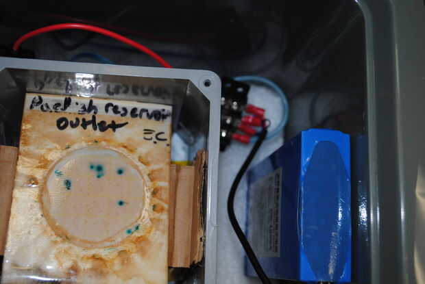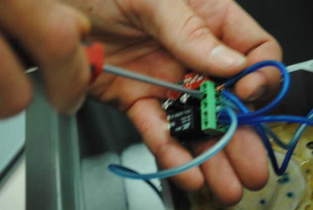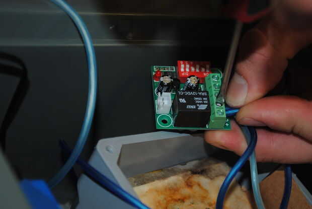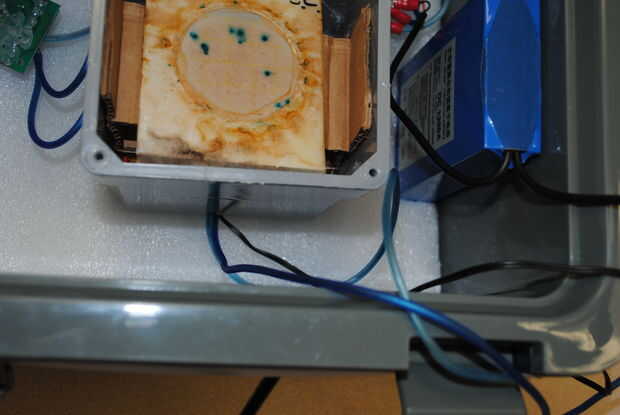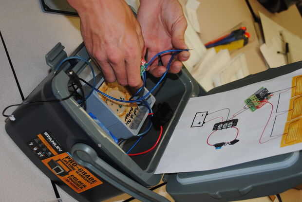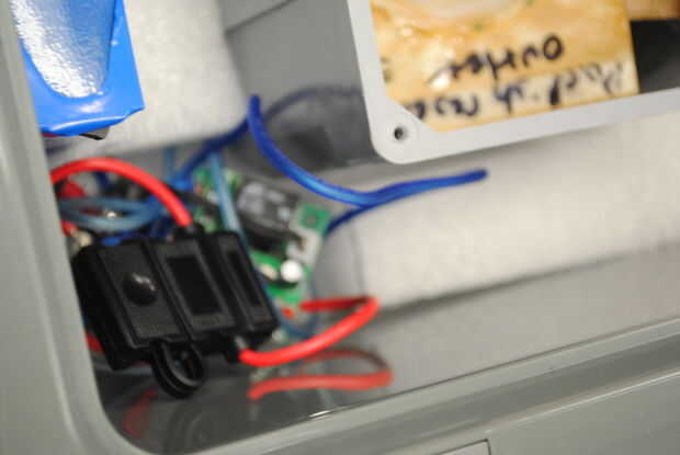 A continuación, coloque el bloque de terminales con las conexiones hacia abajo y colocar el fusible y el termostato en la zona aproximada indicada sobre la capa inferior de espuma.