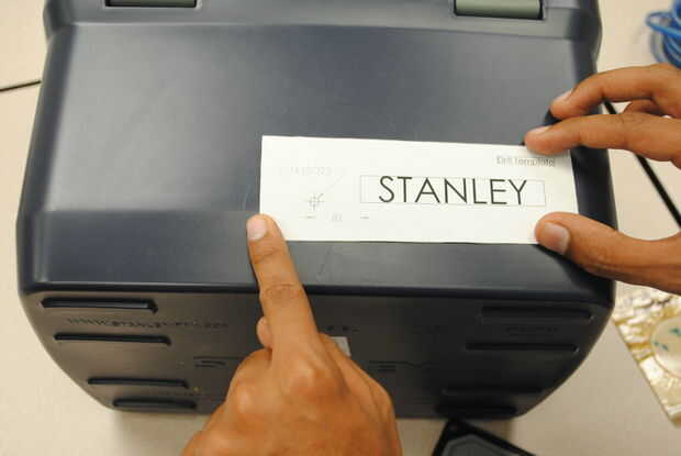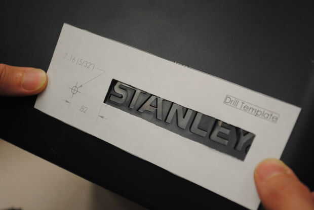 Hemos proporcionado un modelo para mostrar precisamente donde perforar. Tenga en cuenta que en el modelo de refrigerador que utilizamos, hemos igualado el patrón para el logo de "STANLEY", cortar el rectángulo que contiene el texto "STANLEY" y alinear la caja alrededor de la insignia más fresca.
