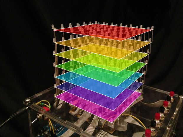Conmutación de los LEDs en capas y columnas hace cubos más grandes posible. Un total de x2 + x salidas digitales son necesarios para controlar tal cubo: x2 para las columnas y las x para las capas. Por lo tanto, para construir un 7 x 7 x 7 del cubo, se necesitan 56 puertos, en lugar de 343. El Arduino Mega tiene 70 pines que pueden ser utilizados como puertos de E/S digitales, dejando 14 puertos abiertos para interruptores de botón externo cambiar el patrón que se muestra en el cubo.