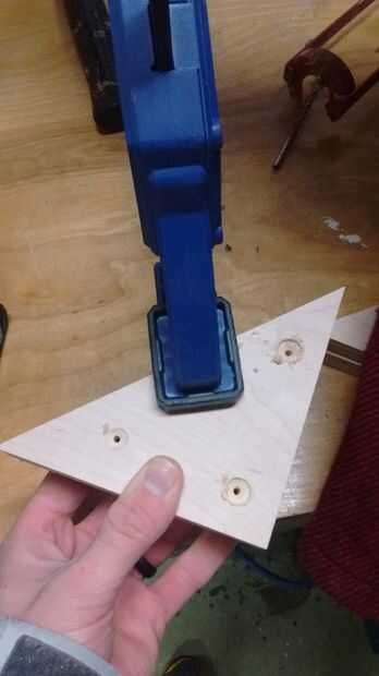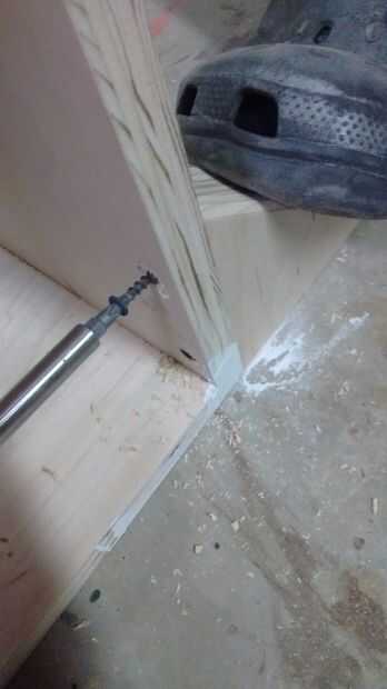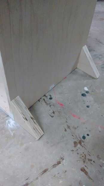 Nos empujó a la izquierda de la librería para ver cómo de estable es, y era más estable de lo que esperábamos. Pero, para asegurarse nunca caería sobre cuando nos estábamos poniendo bicicletas encendido o apagado, decidimos seguir adelante y añadir triangulares pies al lado de la plataforma. Cortar cuatro triángulos de 5" de derecho de ¾" madera contrachapada y encolados/atornillados dos juntos para hacer fuertes pies. Con tres tornillos, aseguró en el lugar. Estos pequeños pies agregan mucha estabilidad a la cómoda.