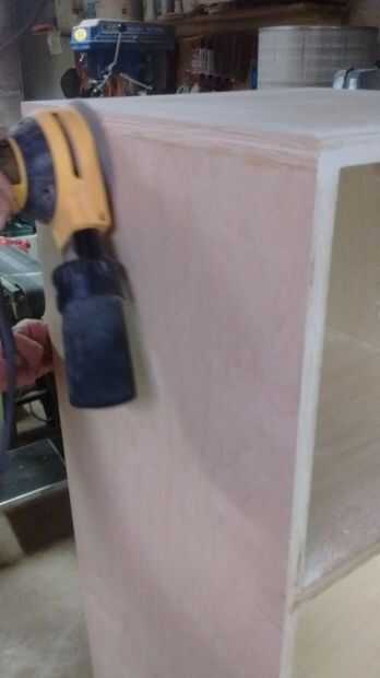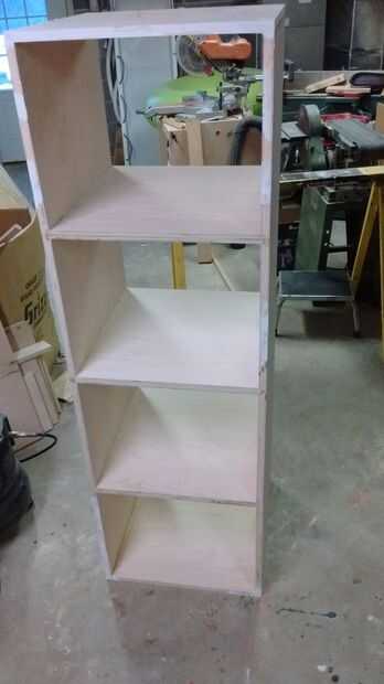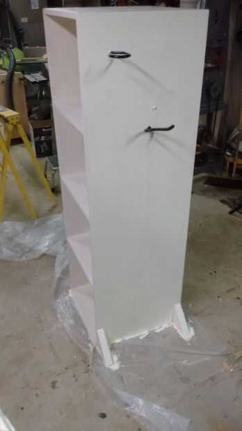 Como cualquier proyecto, aún tuvimos que lijar y pintar la estantería. Puttied los agujeros de tornillos de cabeza avellanada en el superior, inferior y patas de estabilidad, lijadas todos los bordes y poner una capa de imprimación blanca. Luego pintamos el gris estante entero para que coincida con la "cama de aparador" hemos construido (ver mi último instructable!).