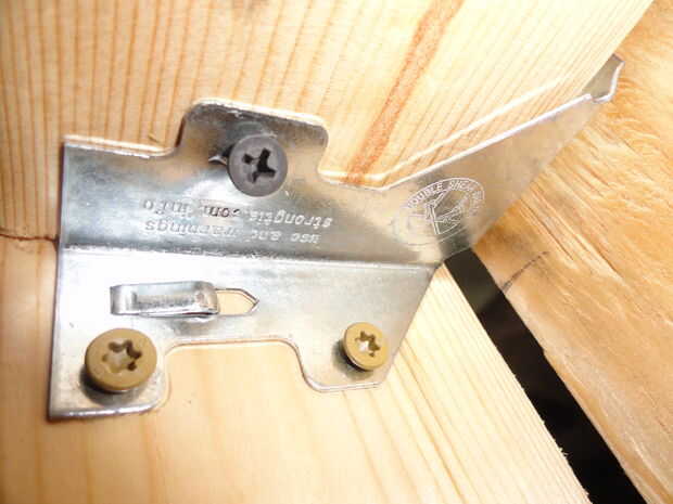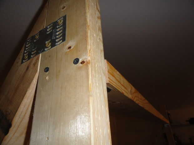 Para las vigas principales de dos simplemente Atornille el conector en el lado luego el 2 x 4. También usé dos de los tornillos de 3" va horizontalmente a través de la cara y en las vigas.