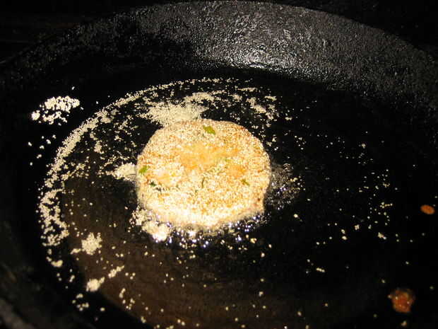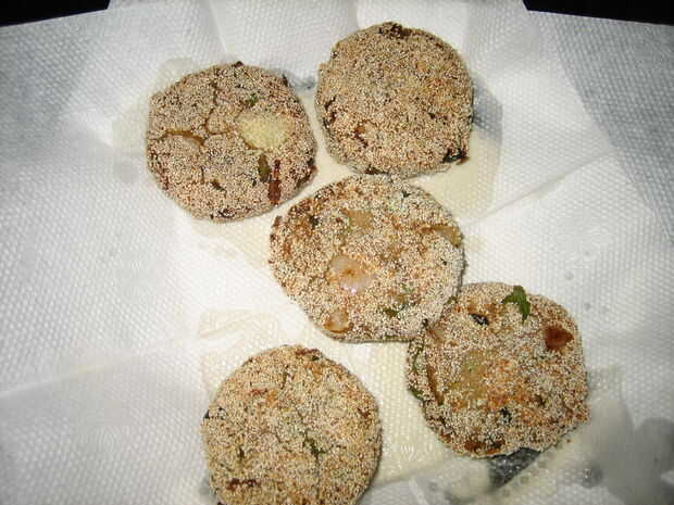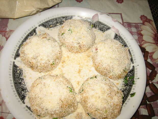 Así que ahora tenemos que forma son tikki ' s. En primer lugar tomar una cantidad generosa de la mezcla y rodar en bolas. Luego aplanar ellos aproximadamente 1,5 cms más o menos. Difundir las migas de pan o sémola y capa cada pulgada de las hamburguesas. Hacerlo hasta que termine cada hamburguesas. Lugar el tikki en un plato limpio y refrigerar por 30 minutos a 1 hora o cuando quieras ya que tiene que estar caliente.