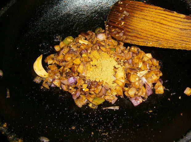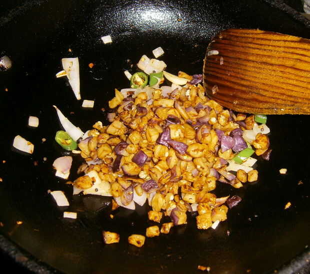Añadir el cilantro en polvo, fritas brinjal y alholva semilla y saltear.