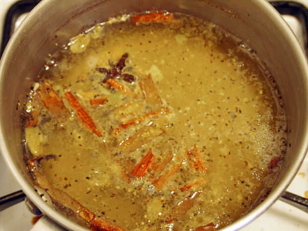 A continuación, en olla pequeña poner el agua y pimienta, clavo, cardamomo, canela, jengibre y anís estrellado a hervir.