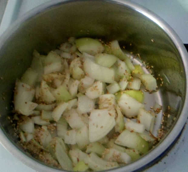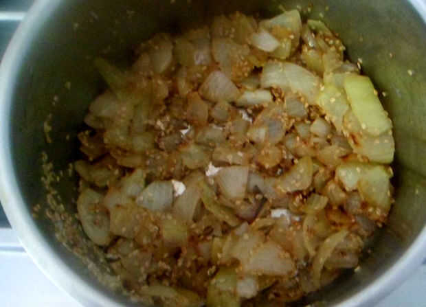 -Añadir la cebolla, las semillas de sésamo y cocinar a fuego muy lento hasta que se suelta olor crudo y se cocinan.