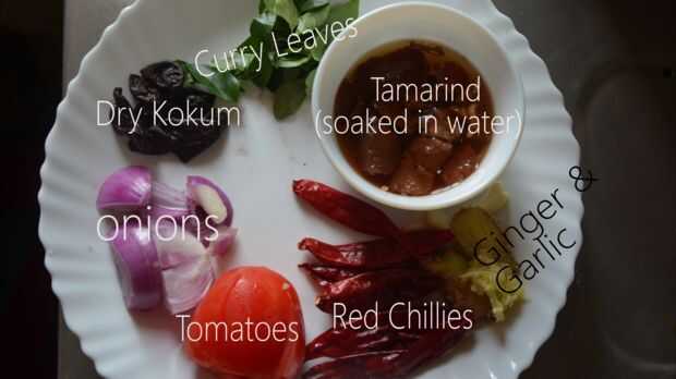 Ingredientes: Las hojas del Curry, kokum (seco), Tamarindo, aceite 2 cucharadas, polvo de la cúrcuma, cebolla, tomates, chiles rojos, ajo, jengibre, leche de coco, CurryLeaves y obvio los peces (MACKERELor indio "surmai" o VIDENTE: adobado con polvo de cúrcuma, jugo de limón, sal)