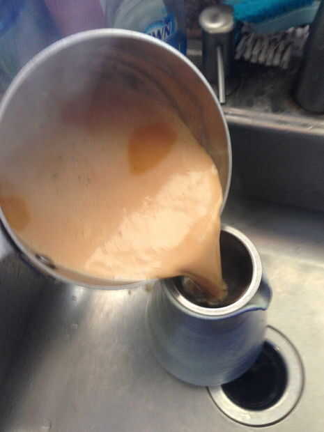 Ahora que se hace el chai, es tiempo de filtrar hacia fuera las hojas y las vainas de cardamomo.