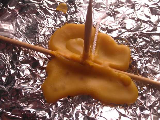 He utilizado cera blanco llano con un crayon amarillo y marrón que se derrite en el.