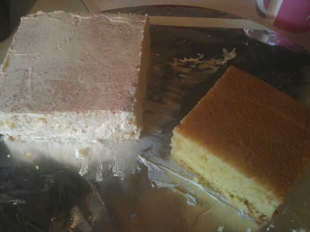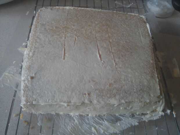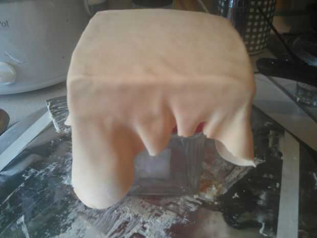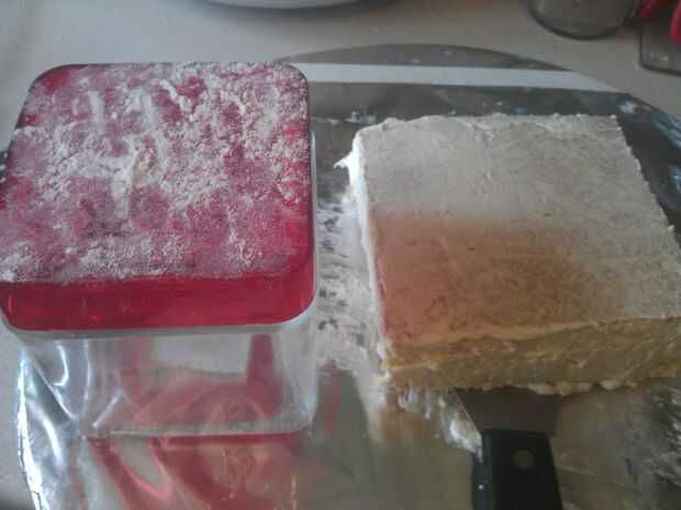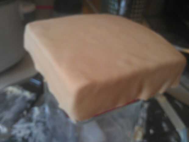 Una vez ajustado, apuntalar las tortas en algo (la jarra roja rematada en la foto) y cuelgue de su rodado encima de fondant.