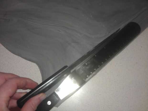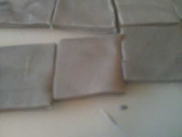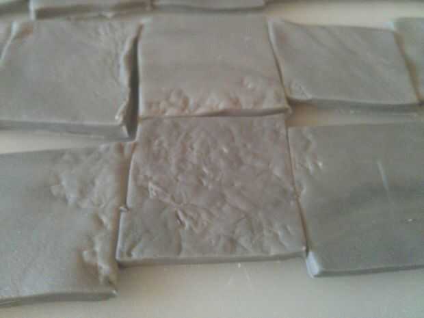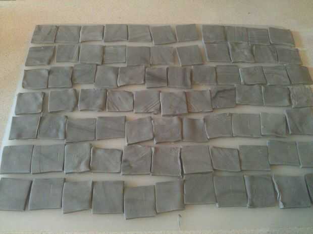 Extienda más gris (fondant) y cortar en cuadrados inch-ish.  Les lío un poco. Usé una arrugada poco de papel de aluminio para conseguir una textura agradable.