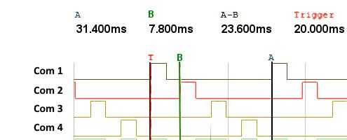 La balanza de cocina digital pasa a tener cuatro líneas de COM que tienen un período de 32ms. Cada pulso es totalmente apagado o totalmente en unos 4ms. Estas cuatro líneas tienen un patrón que se repite permanentemente que nunca se desvía, independientemente de lo que se está visualizando en la pantalla en cualquier momento.