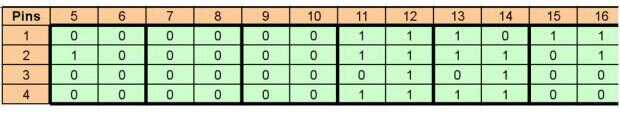 En esta tabla, pongo un 1 para cualquier línea de control que está activa (fuera de fase) con alguna de las señales de COM, como se ve en la imagen anterior del estado de pin. Es muy importante tomar nota de cada icono de activo en la pantalla - algunos de ellos podrían estar relacionados en aparente formas al azar.