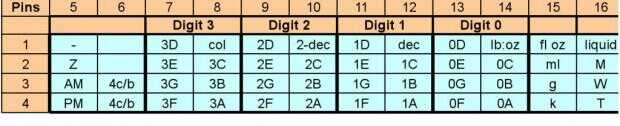 En el caso de la escala de la cocina, los pernos fueron arreglados de una manera que realmente tiene sentido! Los dígitos alfanuméricos se agruparon, en el mismo orden de su pantalla. Las líneas sólo que estaban en un orden aleatorio fueron los iconos de unidad diferentes, pero que era de esperar. Esta tabla muestra qué líneas de control unidad qué segmentos para una determinada señal de COM activa.
