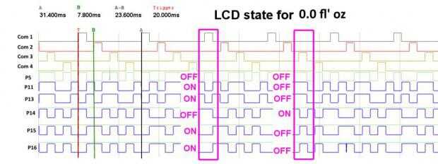 Usando el analizador de lógica (o O alcance) es necesario registrar el estado de cada eje individual para todos los Estados COM. Como la pantalla no cambia, estos patrones se repetición indefinidamente; sin embargo, si cambia un solo segmento, esa señal particular va a cambiar por una de las líneas de COM. Yo he subrayado los Estados de unos pins diferentes señales COM 1 y 3. Aviso, un segmento está encendido cuando un perno es fuera de fase con las líneas COM - cuando el COM está HI, el Pin es LO y viceversa.