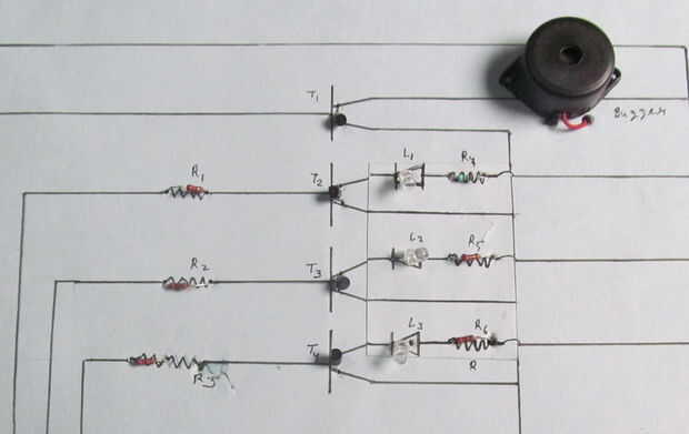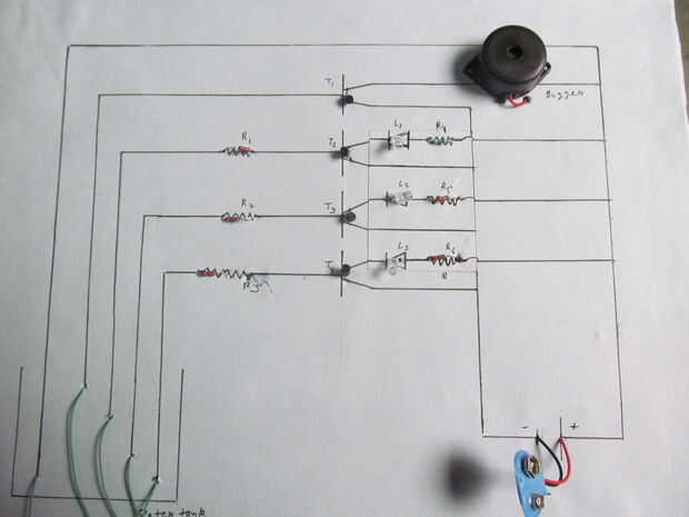 El circuito que consta de 5 sondas de detección que se sumerge en agua para detectar el nivel de agua. Se conecta la sonda A tan común a otros cuatro, que debe ser en la parte inferior la mayor parte del tanque de agua, también actúan como nivel de referencia. Las puntas de prueba B, C, D y E se fijan como