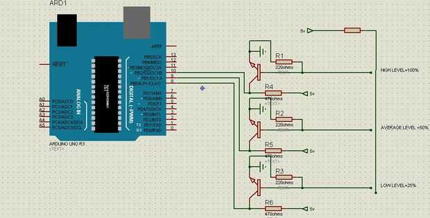 el circuito anterior tiene tres nivel baja, media, alta y cuando Haz realizado nivel de base del transistor de agua aumento debido a la conducción de proceso de la conmutación se produce micro-controlador Haz interrumpido y y muestra el nivel basan en la conducción del transistor correspondiente.