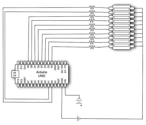 Utilice clavijas 2-9 para los primeros 8 LEDS y pins 14,15 para los dos últimos. Pines 10 al 13 se utilizan para el shield ethernet y por lo tanto están fuera de sus límites.